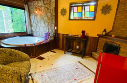 Chalé com cama box, banheira de hidromassagem, chuveiro à gás, TV LCD de 19", DVD, frigobar, lareira, roupão de banho e varanda com rede.