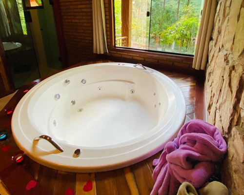 A hidromassagem do Chalé master tem 1,40m x 1,40m de diâmetro. Um ambiente agradável e Roupão de banho.